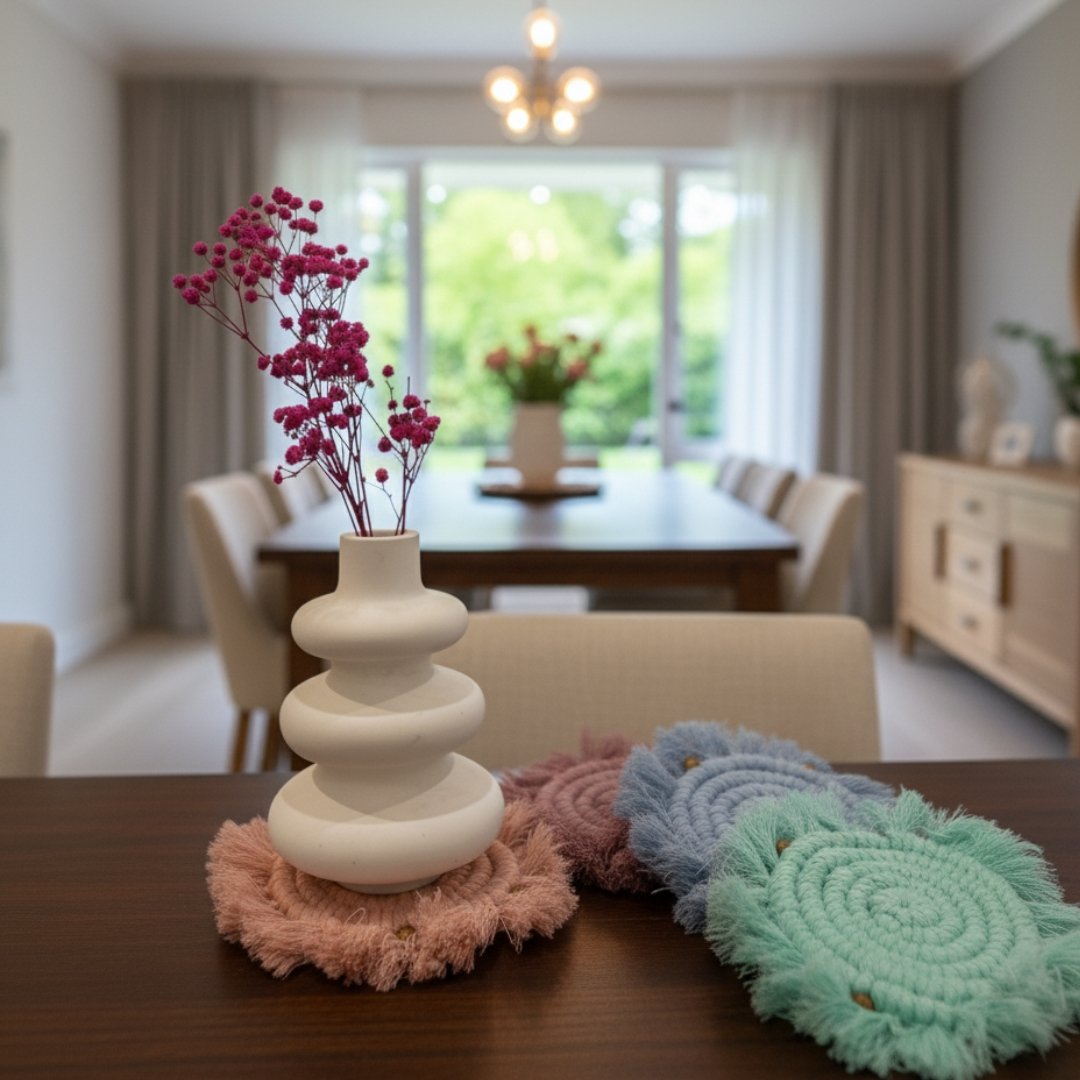 A stylish decorative set featuring a vase paired with 4 colorful handmade macramé coasters. Perfect for adding a pop of color and a cozy touch to your home décor, blending elegance with artisanal charm.