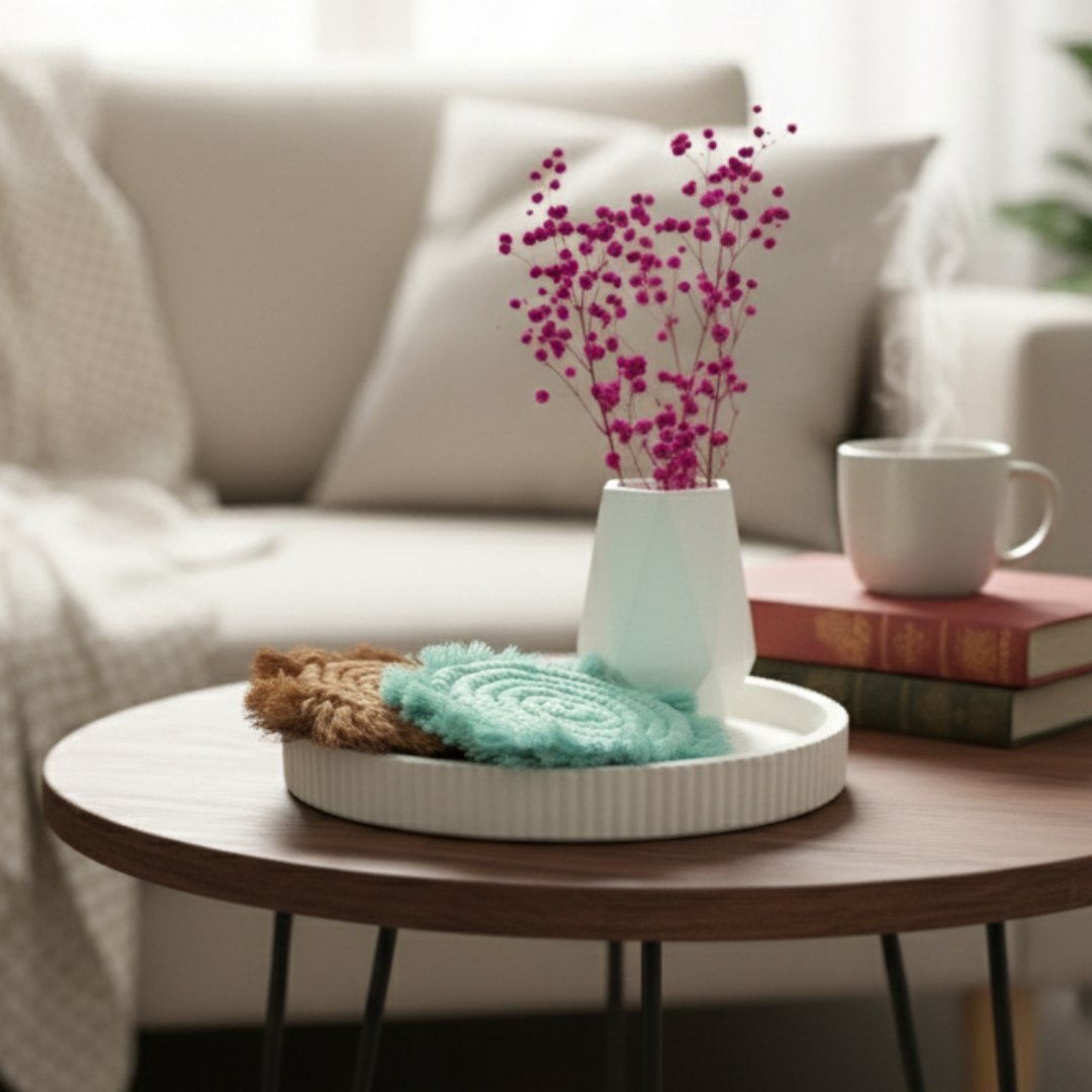 A decorative tray set that combines elegance and coziness, featuring a minimalist tray, a chic white vase, and two handmade macrame coasters in turquoise and warm sand brown. Perfect for adding a stylish and refreshing touch to your home or gifting with love.