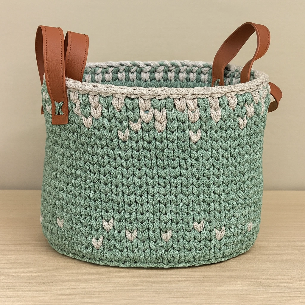 A soft and stylish crochet organizer in mint green with delicate grey accents, perfect for adding charm to any room.